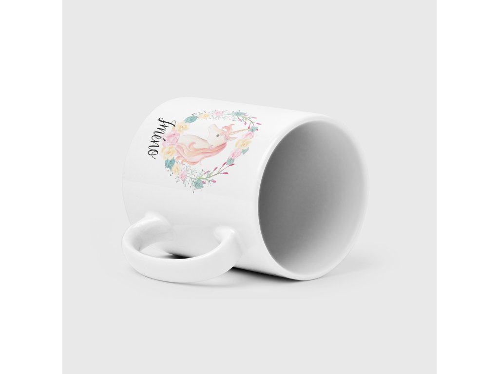 Biely keramický hrnček s vlastným menom Jednorožec 330ml, vo vnútri biely.