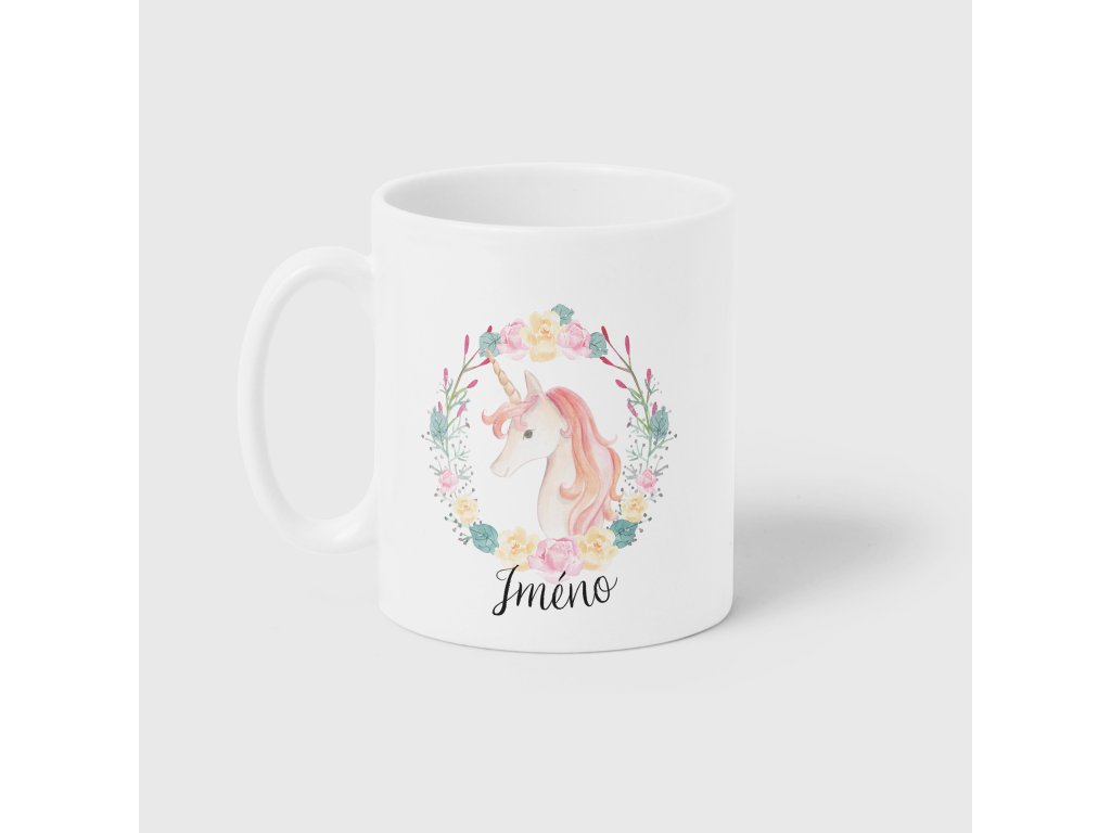 Biely keramický hrnček s vlastným menom Jednorožec 330ml