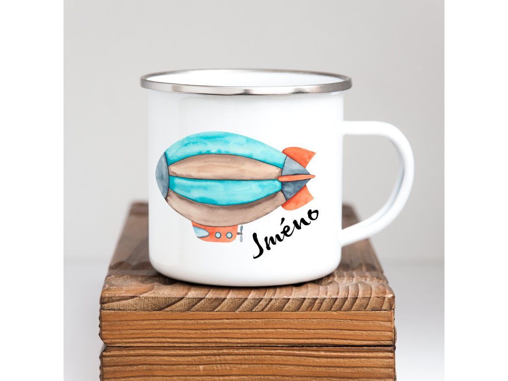 Biely smaltovaný plecháčik hrnček s vlastným textom a vzducholoďou 360ml.
