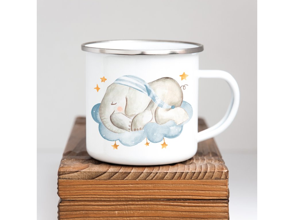 Biely smaltovaný plecháčik so spiacim sloníkom modrý 360ml