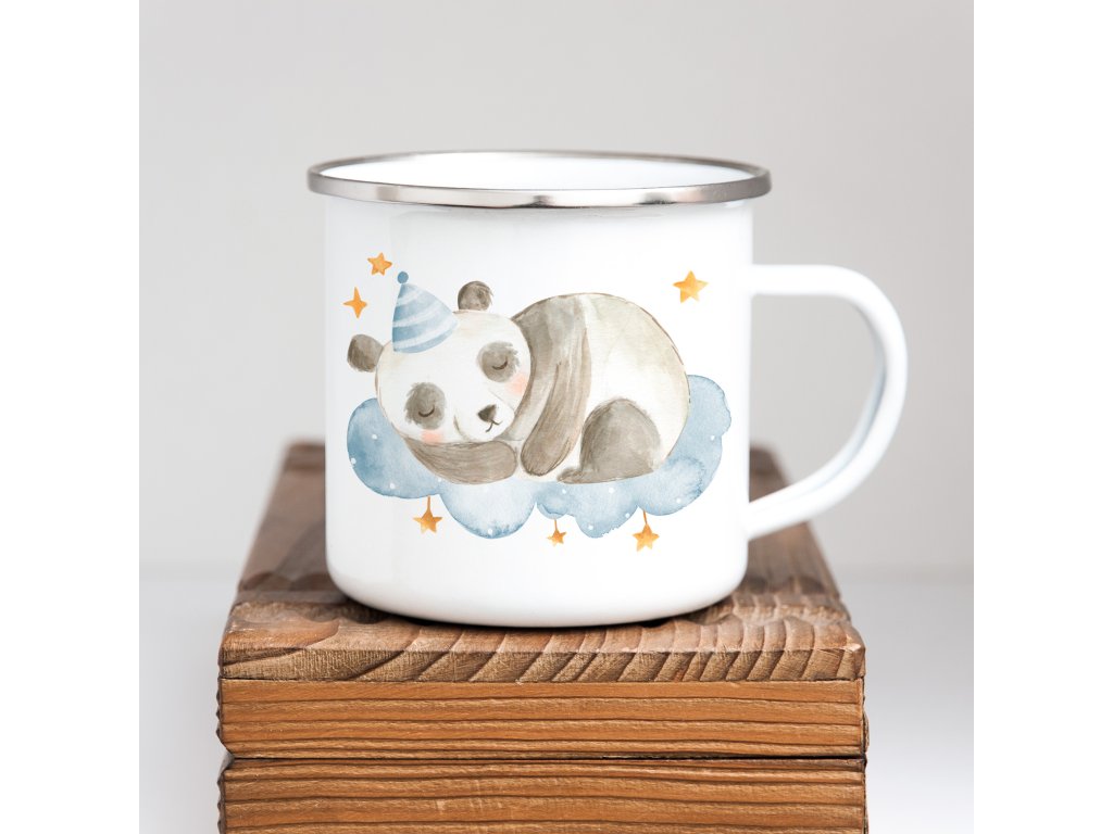 Biely smaltovaný plecháčik so spiacou pandou modrý 360ml