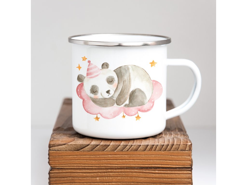 Biely smaltovaný plecháčik so spiacou pandou ružový 360ml