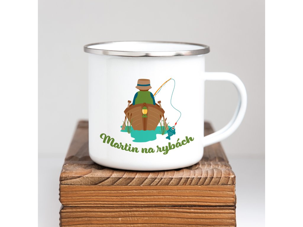 Plecháčik s vlastným menom Na rybách 360ml a strieborným lemom, vo vnútri biely. Skvele sa hodí na festivaly, kempovanie alebo domov na každodennú kávičku alebo čaj.
